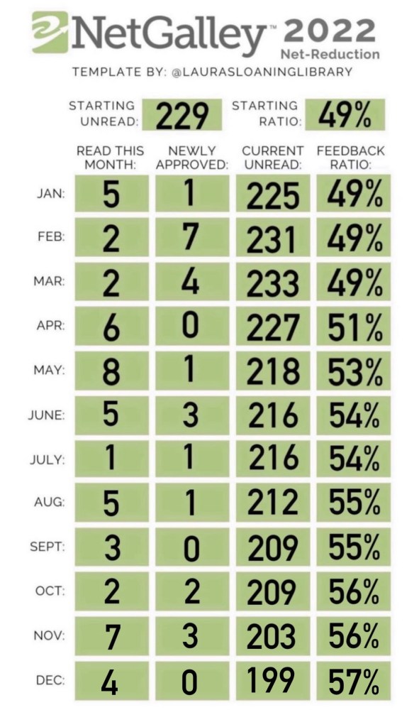 Out of my 22 for 2022 stack I read 12 and DNF’d 2. Leaving 8 unread/un-attempted. I will be doing this again next year and hopefully completing it!